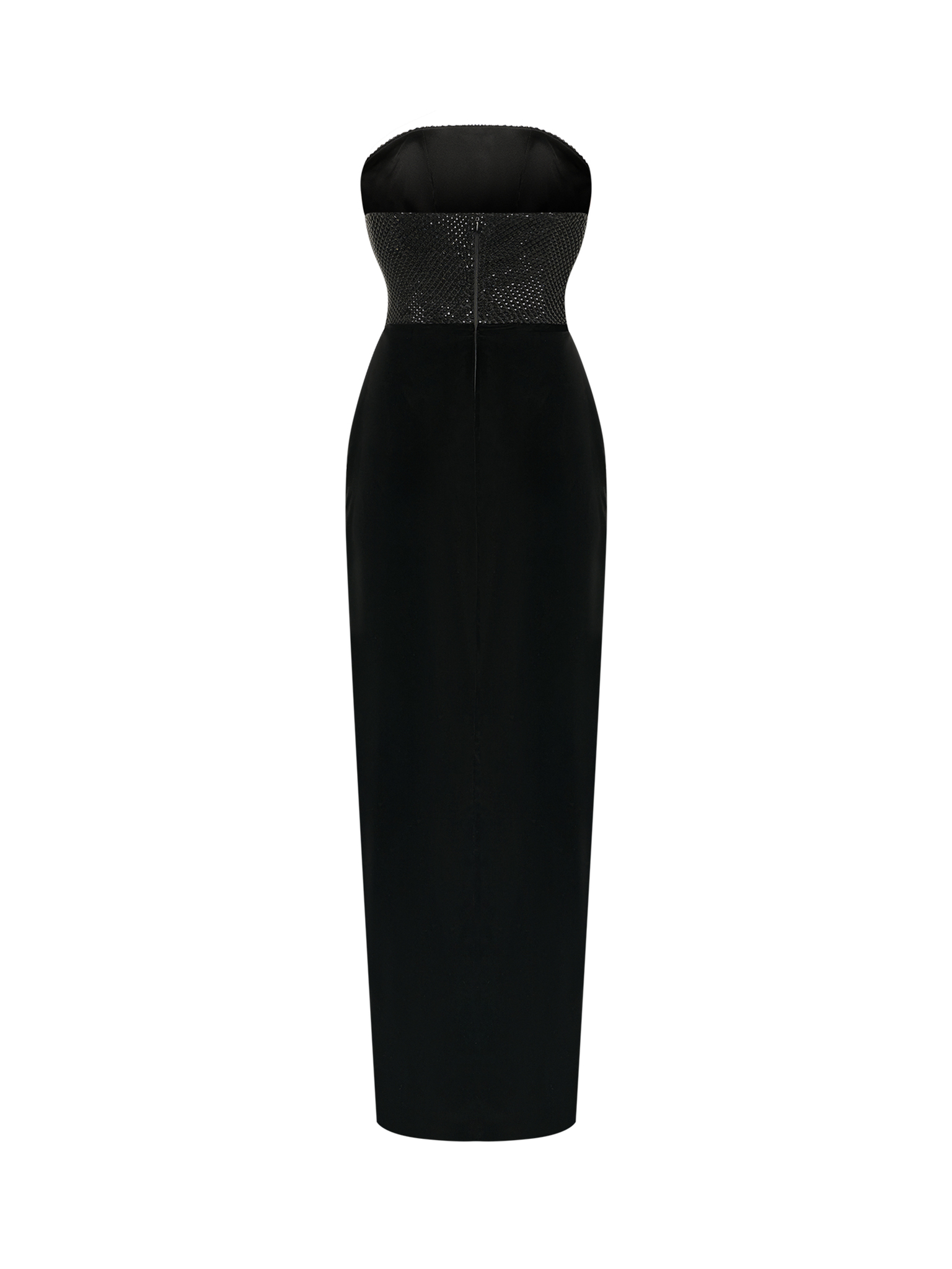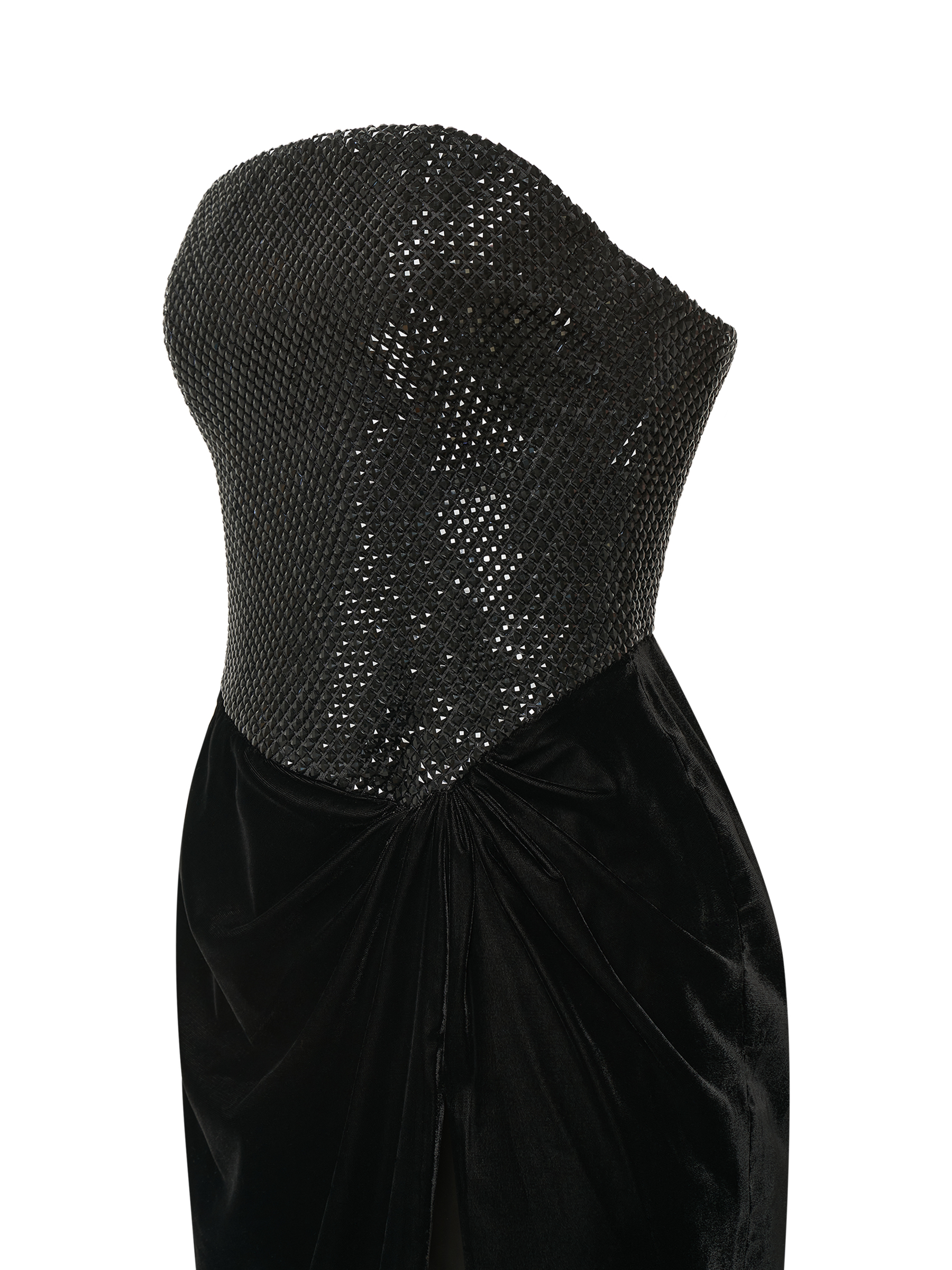 Роскошное вечернее платье из бархата с корсетным лифом, инкрустированным кристаллами. Драпировка и высокий разрез подчеркивают элегантность и чувственность силуэта.