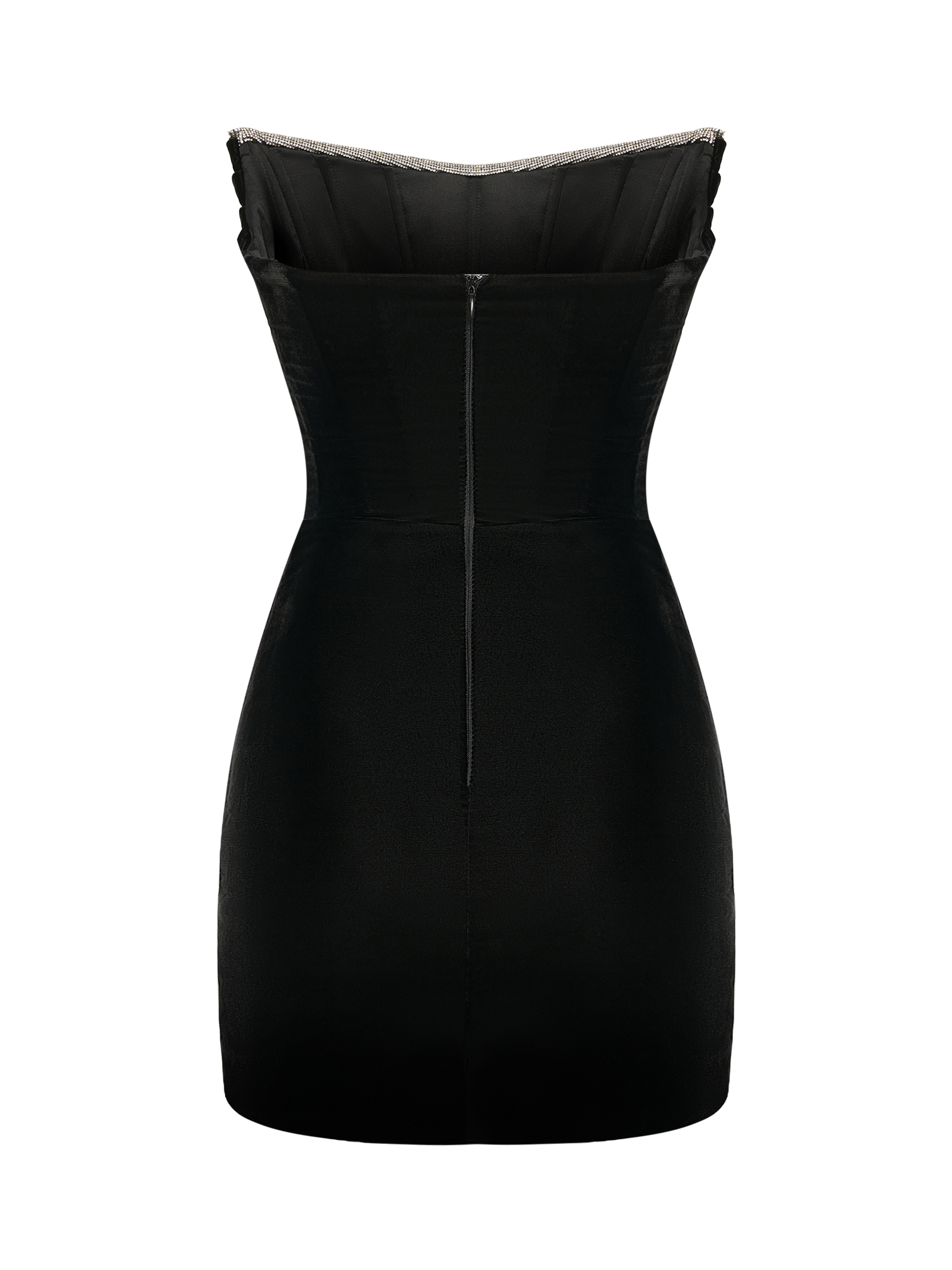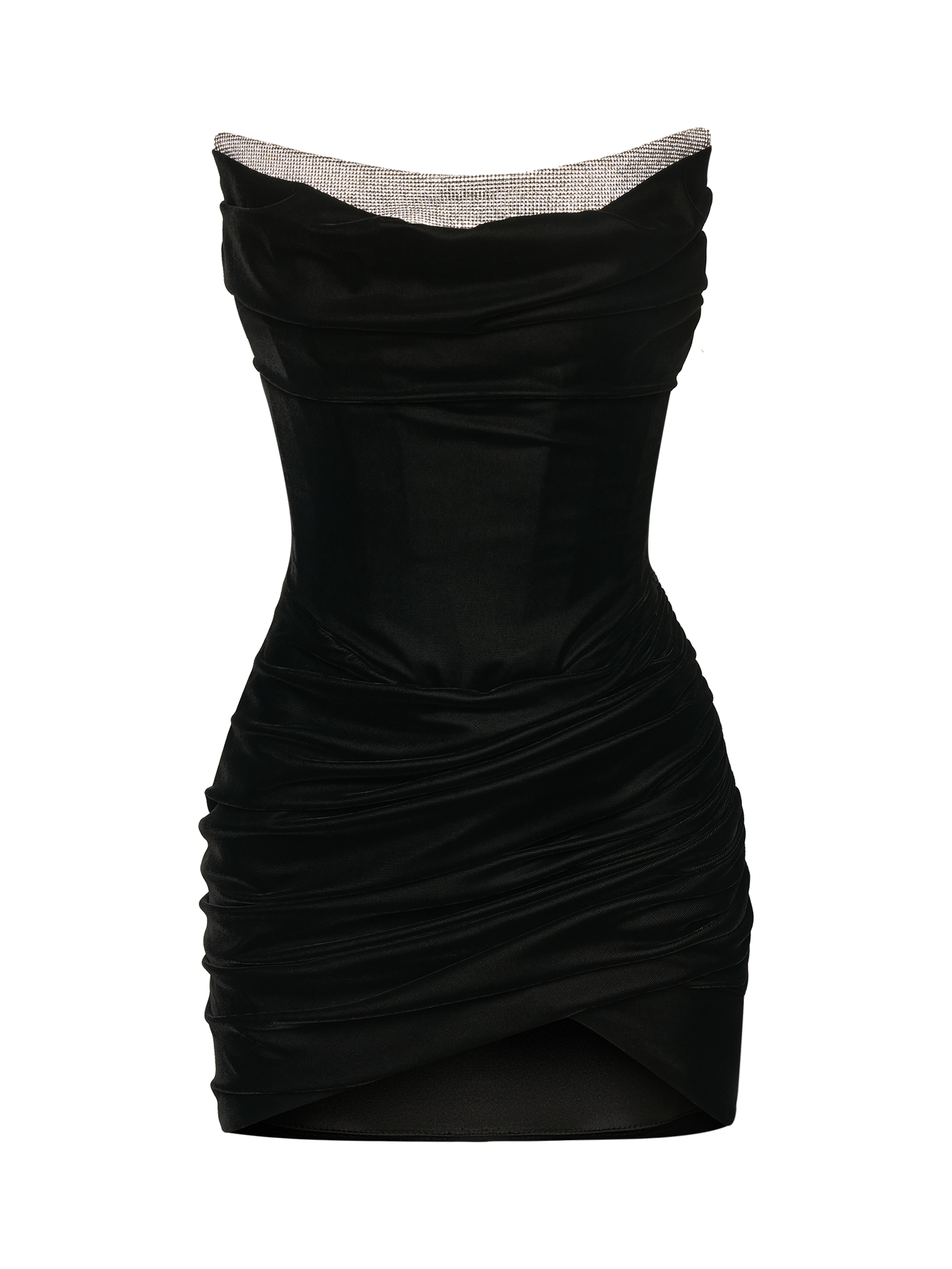 Черное мини-платье с защипами и мерцающей отделкой из кристаллов по линии горловины. Смелый силуэт в сочетании с утонченным блеском для тех, кто ценит выразительные детали.